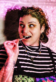 Marcelyn is also a visual artist who dabbles in many mediums, but particularly fiber / yarn, watercolors, and markers to create colorful, whimsical art, like knitwear, beaded jewelry, oracle cards, and more. She very rarely sells her art, advertised under the name YouCraftyBitch, at in-person events and through her Instagram. However, you can see her art everywhere she goes, as it is infused into all of her work and daily life. Aside from making silly little things to wear every day, Marcelyn also hand-makes all of the merch sold at her shows, creates all of the sets and costumes for her music videos, uses a handmade oracle deck for her readings, and so much more. She is a DIY artist through-and-through!